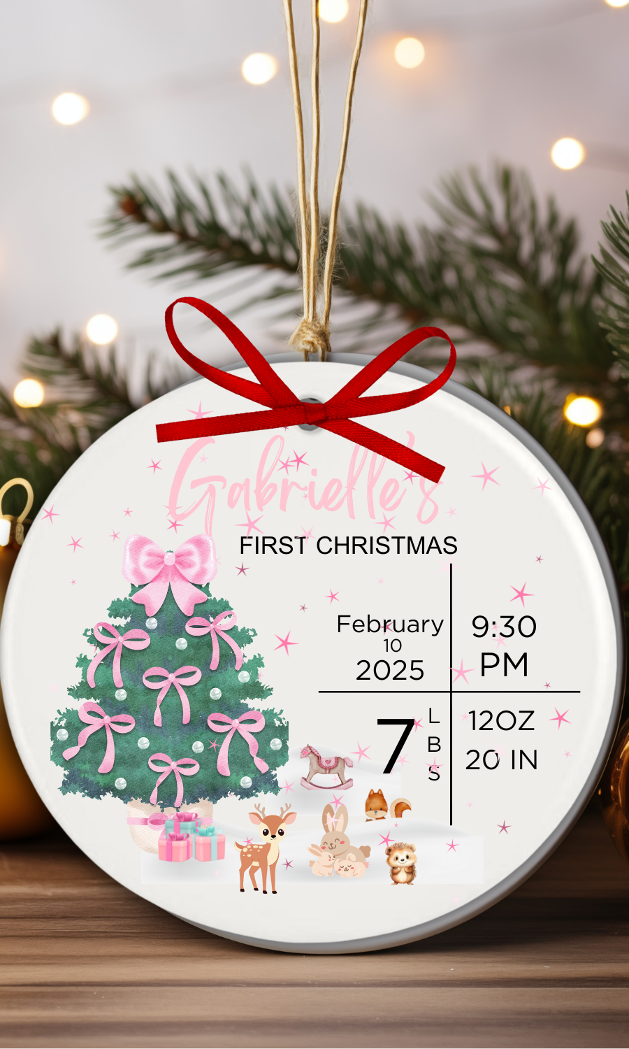 Any wording of your choice. preferable, Child’s name, First Christmas and Year